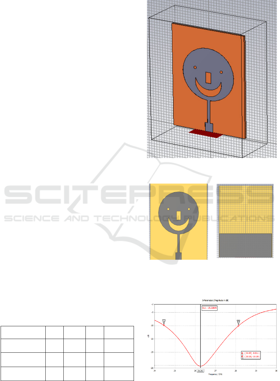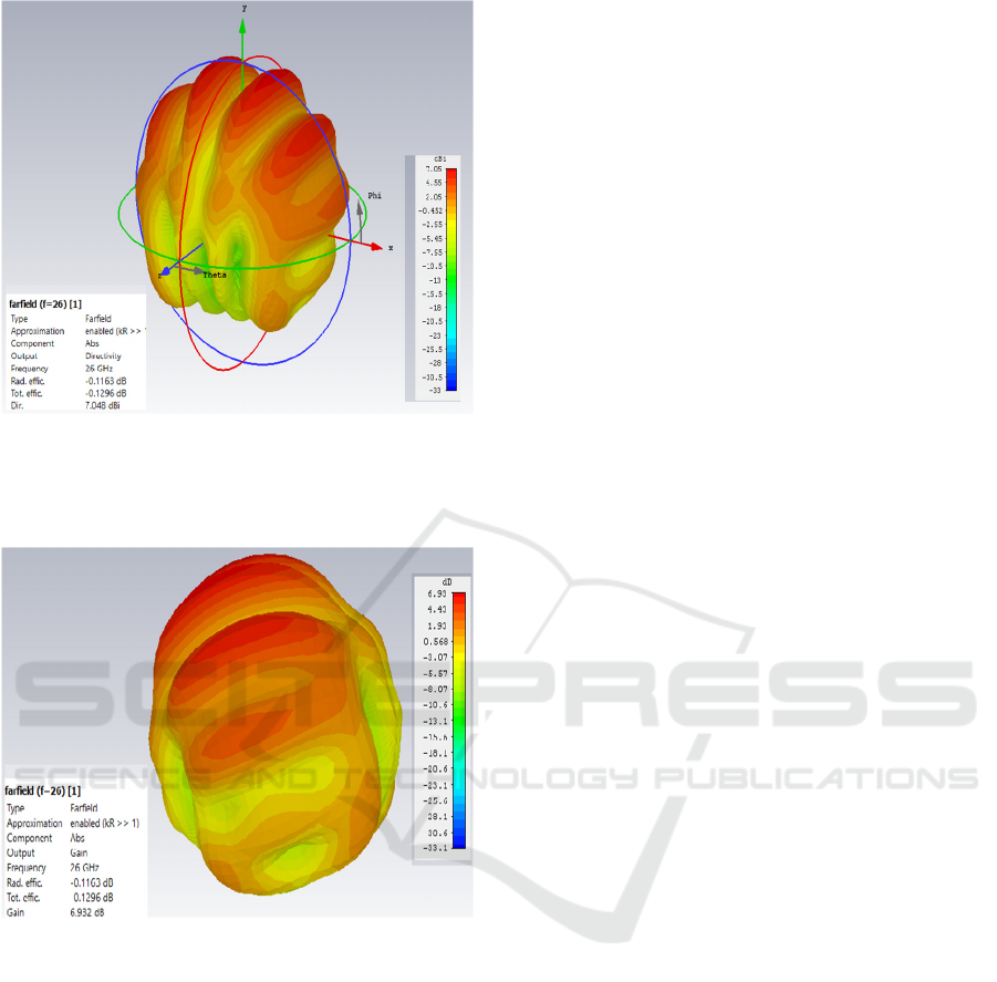 monopole patch antennas resonates at 26 GHz and operating band 24.4-28.2 GHz. The achieved gain 6.93